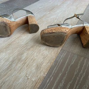 They sandals are super comfortable with the platform. I will remove the pads when I ship. I need them because I have narrow feet. Trendy silver leather with cork platforms and heels. There are signs of wear throughout with markings and scuff marks.