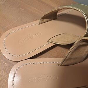 Gold flat sandals.