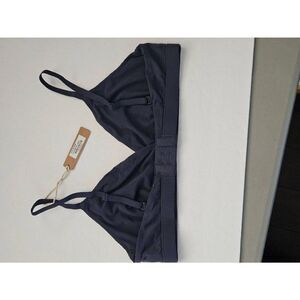 Deep royal color, size medium. Adjustable straps, double hook and eye back closure. Mesh lined cups. Fabric is 76% polymide, 24% elastane. Very soft and comfortable!
