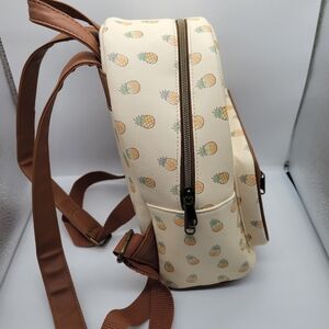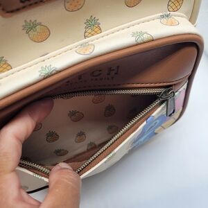● This mini backpack bag from Lilo & Stitch is printed all over with pineapples and Stitch drinking from a coconut on the front zipper pocket, with a brown panel above that says his name and "Ohana means family." Featuring adjustable straps, top zipper closure, top carrying handle and internal zipper pocket