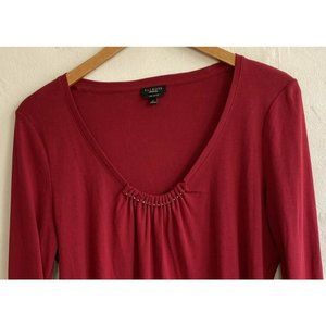 COPY - Talbots Knit Top Large Red Pleated Gathered Neckline Studs Beads Long Sl…