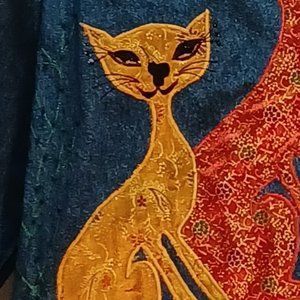Tantrums, womens cat embroidered denim large button up jacket. Top button missing.