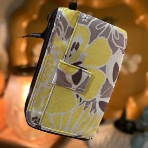 Stylish wristlet clutch by Thirty-One. Features a vibrant floral pattern. Convenient wrist strap for easy carrying.