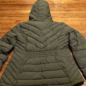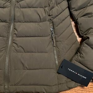 Stylish olive green puffer jacket by Tommy Hilfiger. Features a hood and zippered pockets. Perfect for cold weather.