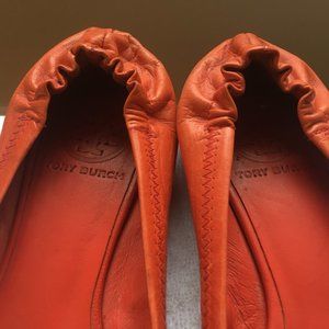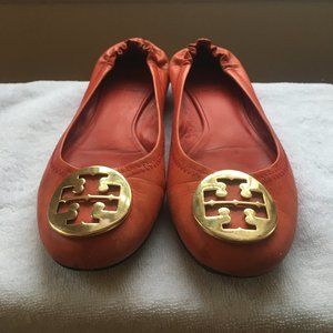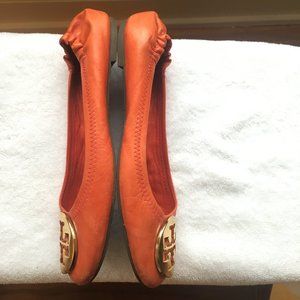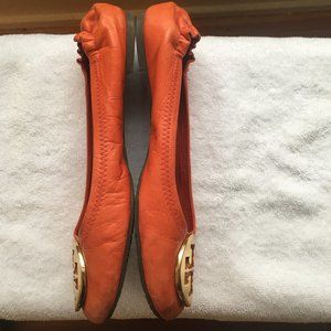 Tory Burch classic Reva ballet flats in orange and gold. Iconic gold Tory Burch logo. The heel of the shoe has excellent stretch to allow for a secure and comfortable fit.