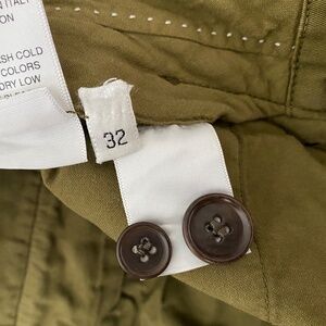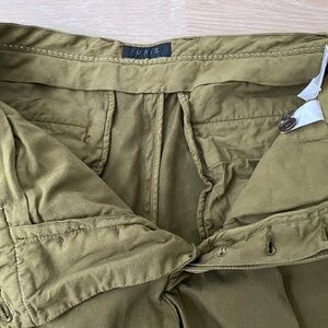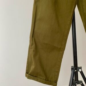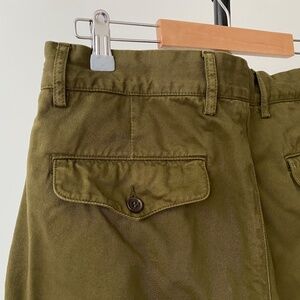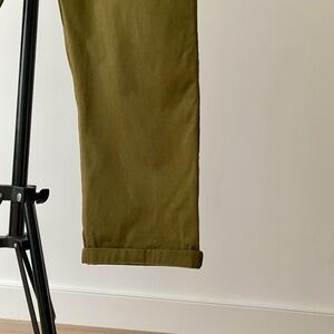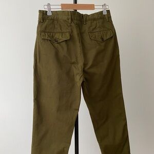 Olive green UNIS Davis Pleated mens chino pants are single pleated with pocket button fly. Its high rise transitions to a comfortable thigh and tapered leg flawlessly. Back flap pockets. In great used condition, no rips, tears or stains.