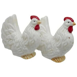 Vintage White Chicken and Rooster Salt & Pepper Shaker Set Spice up your kitchen with this charming vintage salt and pepper shaker set featuring a white chicken and rooster design. Made from ceramic and porcelain materials, these shakers are perfect for all occasions and are sure to add a touch of country style to your table setting. The set includes a pepper shaker and a salt shaker, both adorned with intricate all-over patterns and animal-shaped details.