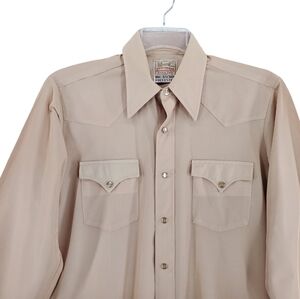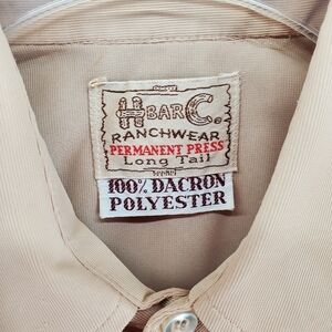 COPY Vtg H Bar C Shirt Men 15 1/2 Long Tail Slim Pearl Snap Tan Dacron Polyester
