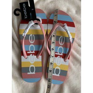 Women’s Sandals Size 8 Mindee BEBE LOGO Striped Pink Multi FLIP FLOPS .This playful summery flip-flop features a studded Bebe logo on the strap and a Bebe-patterned footbed.