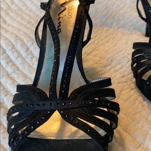 small heel with black rhinestones...worm once for dance pictures super comfy