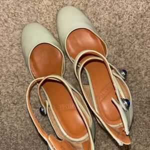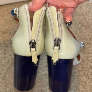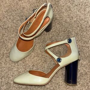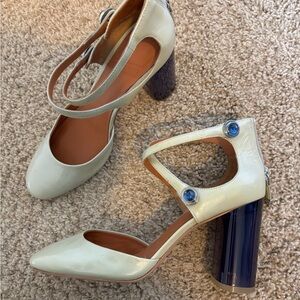 These stylish heels feature a classic Mary Jane design with a modern twist, showcasing a cream upper and a contrasting blue chunky heel. The vintage-inspired silhouette and comfortable block heel make them perfect for any occasion.