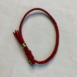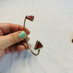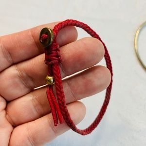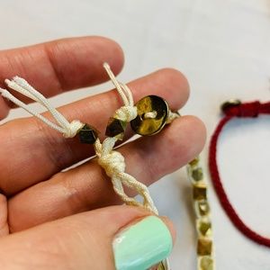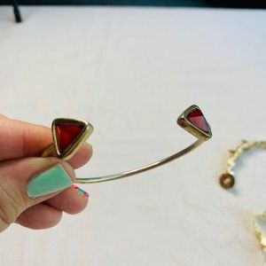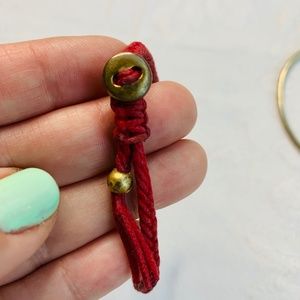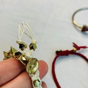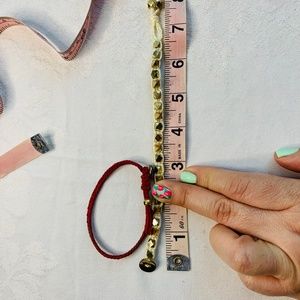 set of 3 fashion jewelry bundle red and gold spiked bracelets. Includes one red braided rope thread that slids to adjust, one red triangle slip on bracelet, and one white braided with gold studs and spikes. All costume jewelry. See approximate measurement pics. Smoke free home.