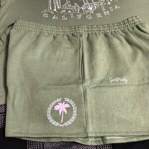Ivy fleece shorts with a relaxed fit and a short sleeve campus logo T-shirt. The T-shirt has the small P LOGO on the front and the larger CALIFORNIA LOGO on the back in the same style. These shorts also have a small LOGO DESIGN on the front of the shorts at the bottom. The shorts have two front side pockets and a drawstring waistband. This makes it convenient if you need to tighten or loosen the waist size for a better fit. The campus T-shirt does fit slightly oversized.