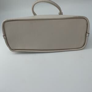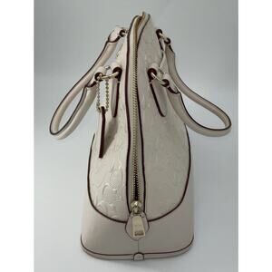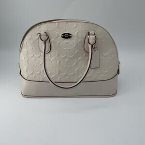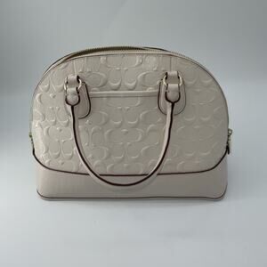 The CORA DOMED SATCHEL in Debossed Patent Leather by Coach (Model F34052) in Light Gold/Chalk is a medium-sized semi-circle shaped shoulder bag with a zip closure and double handles in chalk color. Made of leather with a patent finish, this stylish bag is perfect for various occasions such as weddings, parties, workwear, and more. The gold-plated hardware adds a touch of elegance to the design, which also features a detachable strap and brand card accessories. With a signature C pattern and a brown leather interior, this Coach Dome product is a versatile and chic addition to any wardrobe.