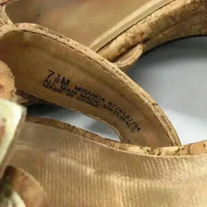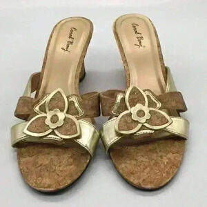 Coral Bay gold/cork slides w/3” heel size 7.5. All man made materials. Cork and gold flower accent. Wedge heel. Thank you for coming by our closet. Make us an offer! We are a fast shipper. Come back soon. F98