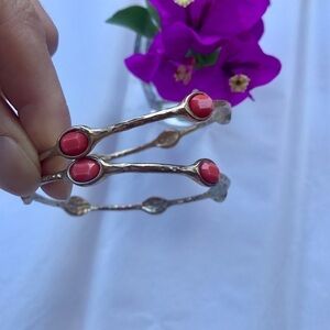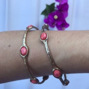 Two coral/orange on gold tone bangle bracelet. Some wear but generally in same condition as when originally purchased new.