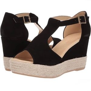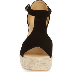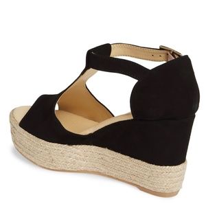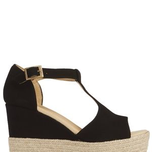 - Peep toe - T-strap vamp - Adjustable buckle strap closure - Suede upper - Cushioned footbed - Wedge - Platform espadrille - Approx. 3.5" heel; 1.25" platform