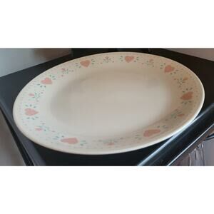 This set of two dinner plates from Corelle's Forever Yours collection is the perfect addition to any dinnerware collection. The plates measure 10 1/4 inches in diameter and feature a beautiful sand color with a heart and retro theme. The plates are made of pressed glass and are stackable, microwave and dishwasher safe. They are also break-resistant and have a glossy finish. The set is original from the United States and is printed with a backstamp. Ideal for all occasions, these vintage plates are a must-have for anyone who loves the theme of love and vintage decor.