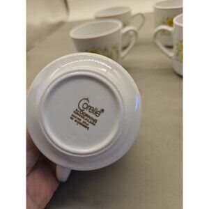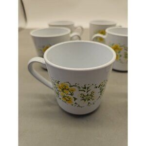 This vintage Corelle by Corning April Flowers set includes 8 round coffee tea cup mugs in a retro design. Made in the USA in the 1970s, these mugs feature a glossy finish with a floral pattern in yellow, green, and white colors. The mugs are dishwasher safe and suitable for hot beverages, making them a practical and decorative addition to any home. These original retro mugs are a perfect choice for those who appreciate vintage pieces with a touch of nostalgia.