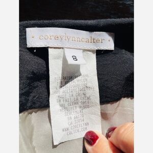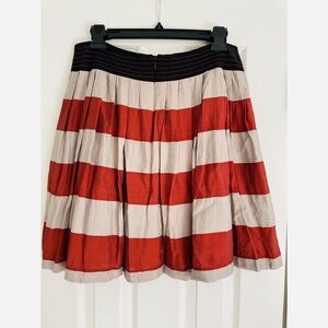 Description: Fun Corey Lynn Calter striped pleated skirt. Fully lined. Zipper and hook/eye closure in back. Has pockets. Black waistband. Stripes are brick red and grey. Looks great with a pair of black knee-high, moto, or cowboy boots.