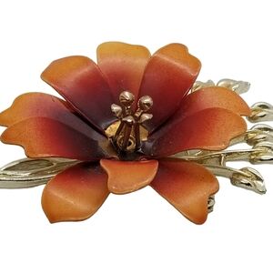 Beautiful large vintage goldtoned flower brooch by Coro detailed with vibrant red/orange ombre enamel. Brooch is in good condition with a little enamel missing from center of brooch where the goldtoned bud prongs are. This is where some of the enamel flaked off due to age. Brooch is in otherwise great condition. Piece measures 3 inches tall and 2 inches wide.