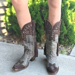CORRAL A3127 distressed gray leathe snip toe cowgirl boots chocolate fringe sz 7