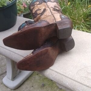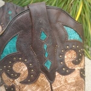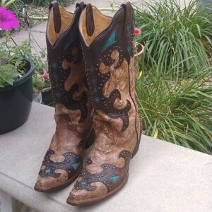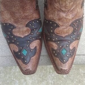 CORRAL AB019 "El Paso" leather snip toe cowgirl boot tan/brown/turquoise sz 9.5. a few grommets missing but does not take away from the classy look of these boots