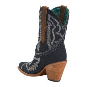 stacked block heel, western design, embroidered detail, strap and buckle accent, denim texture