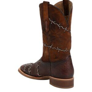 stacked block heel, pull on loops, wide width, barbed wire design, grained detail, handcrafted, western embroidery