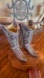 Crafted from high-quality taupe grayish brown distressed leather, these boots feature intricate wing and cross cutout designs accented with shiny black sequins. The addition of white embroidery outlining the wings and cross adds a striking pop of color.