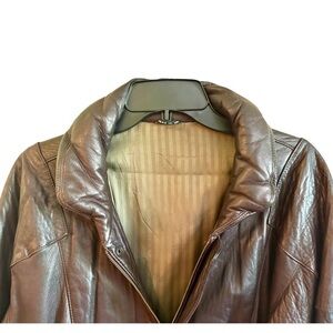 CORTEFIEL DE ESPAÑA, MENS, BROWN LEATHER JACKET. MADE IN SPAIN. SOFT & SUPPLE LEATHER WITH ATTRACTIVE INTERIOR LINING. 2 FRONT WELTED POCKETS, ZIP FRONT CLOSURE WITH CONCEALING FLAP & SNAP AT TOP & BOTTOM, ELASTIC STRETCH WAIST. IN VERY GOOD CONDITION. SIZE 40