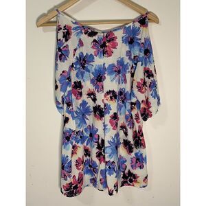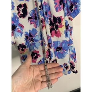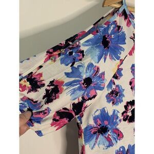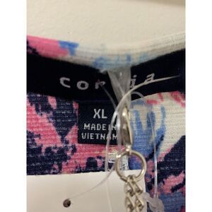 CORVIA Women Size XL Blue & Pink V-Neck Cold Shoulder Sleeve Blouse w/ Necklace