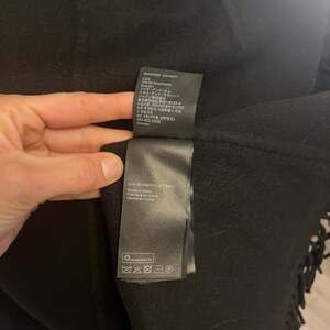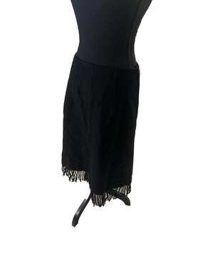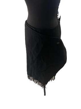 COS Black Asymmetrical Wrap Skirt with Fringe Trim, Size M. This minimalist piece features a unique wrap-around design with a button closure and an elegant fringe hemline. Crafted with a premium wool-blend feel, it offers a clean, architectural silhouette typical of COS styling. Perfect for professional or contemporary evening wear. Excellent pre-owned condition with no visible flaws or pilling. EUR size 36
