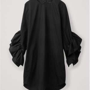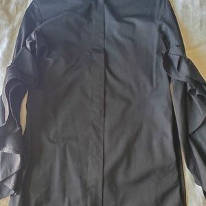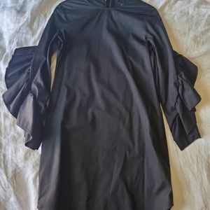 Elegant black dress. Features dramatic ruffle sleeves. Perfect for any occasion.