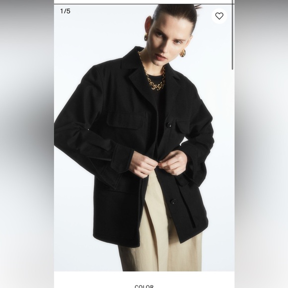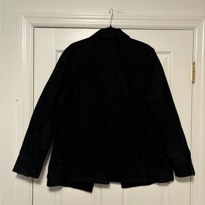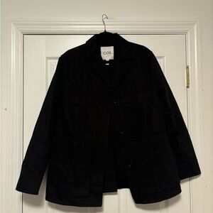 Stylish black utility jacket. Features button closure and lots of pockets, button wrists, and notched lapel. Made out of thick twill cotton, perfect for layering.