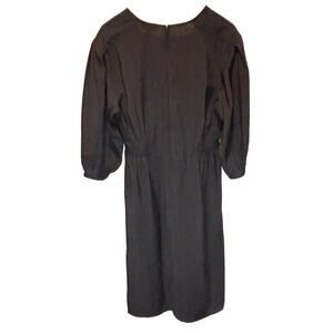 3/4 balloon sleeve. Elastic at each side of the waist cinches the dress in. Hidden zip up the back. V-neck.