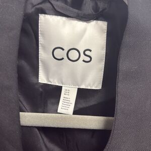 Discover the sleek sophistication of this black blazer from COS, featuring a minimalist design with a collarless neckline and a structured silhouette. Crafted from a smooth fabric, this versatile piece is perfect for adding a touch of modern elegance to any outfit.