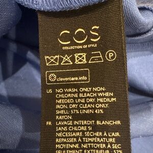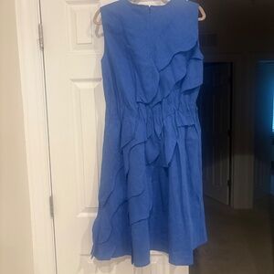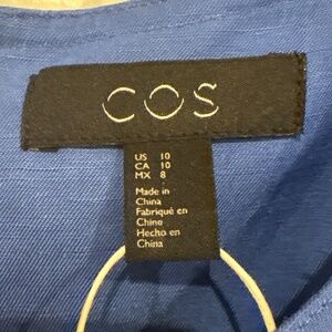 Brand new COS cornflower blue ruffle dress. 42" length x 18" bust (stretches). Zipper in back of dress.