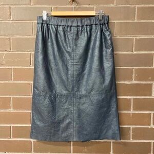 COS leather top and matching skirt. Color: blue/grey. Material: leather. Top: box shape unlined t-shirt with long back zip opening - raw hem; size 6. Skirt: straight skirt with elasticized waist, back slit and fully lined with raw hem; size 8. Incredibly soft buttery crushed look leather.