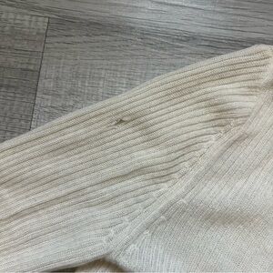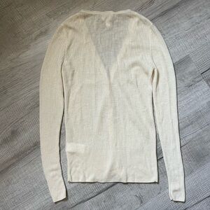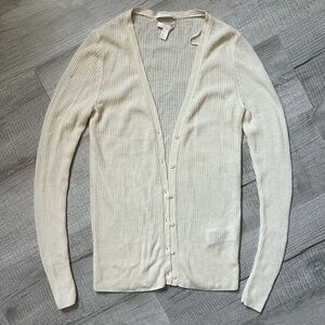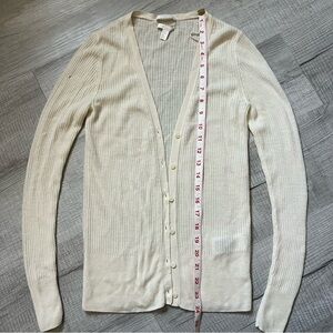 Elegant cream ribbed cardigan with button-up front. Perfect for layering. Small hole shown