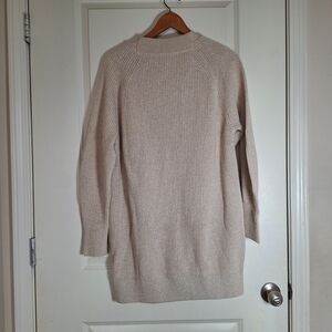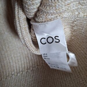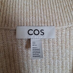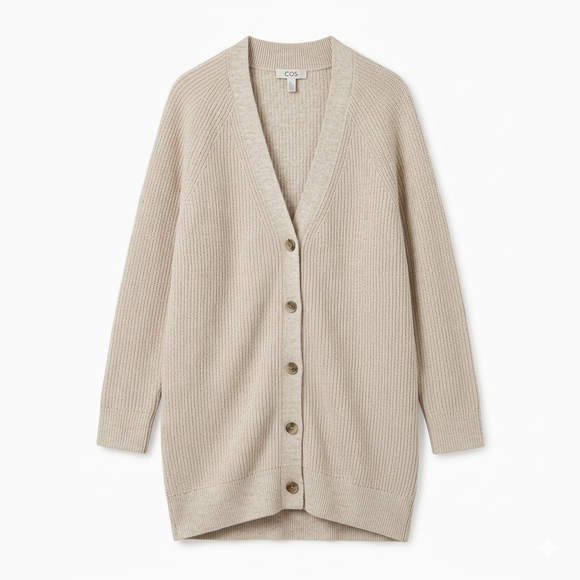 The COS Beige Ribbed Knit Longline Cardigan Sweater is a stylish and versatile piece perfect for the winter season. Made from a wool blend fabric, this oversized sweater features a relaxed fit with a V-neckline and long sleeves, making it ideal for casual occasions. The beige color and solid pattern add a touch of sophistication, while the brand COS ensures quality and style. Perfect for layering in the colder months, this cardigan sweater is a must-have addition to any woman's wardrobe.