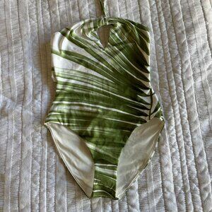 This contemporary swimsuit is a marriage of impeccable cut and craft. Decorated with botanical-green palm leaves, it's crafted from contouring recycled-nylon scuba that's enhanced with stretch for comfort and shaped with modern cutouts at the chest and back. It fastens with slender halterneck ties. Tie and clasp fastening.
