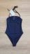 Navy COS one-piece swimsuit with a clean, minimal look and flattering shape. Bandeau neckline with a small U-shaped metal detail in front, plus removable halter straps so you can wear it strapless or tied for extra support. Smooth stretch fabric with a double-lined finish that feels secure without being bulky. High-cut leg and simple back design.