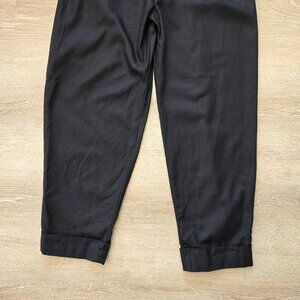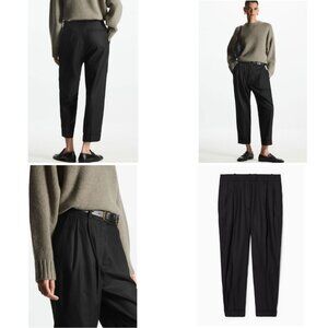 New with tags COS high-waisted tapered twill trousers in classic black. Made from a smooth and breathable blend of 57% lyocell and 43% cotton, the fabric has a soft drape with enough structure to hold its shape. Designed to sit above the hips, these trousers feature double front pleats that create an easy, relaxed line through the thigh, tapering cleanly toward the ankle. The turned-up cuffs give a slightly cropped look that works well with loafers, sneakers, or boots.