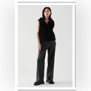 Sustainably crafted from recycled polyester with a viscose lining, this black, hooded gilet features a cozy faux shearling finish with a hidden placket and back seam for a relaxed fit. Hidden Button down front closure.