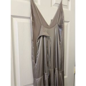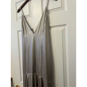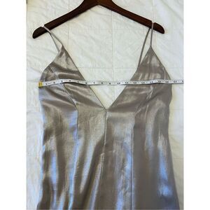 Debuted on the NYFW runway, this striking slip dress is designed to fall elegantly to the floor. It's expertly designed with a deep V-neckline, slender spaghetti straps and dips to a low, scooped back. The side slits through the flared skirt emulate the graceful movement of a feather as you walk.