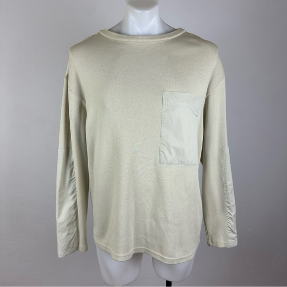 Sophisticated off-white sweatshirt with an oversized chest pocket detail. Ideal for versatile styling. Classic crewneck finish. Comfortable ribbed detail.