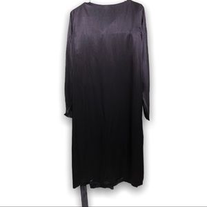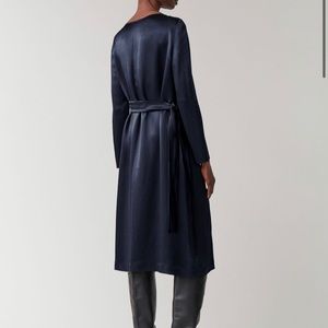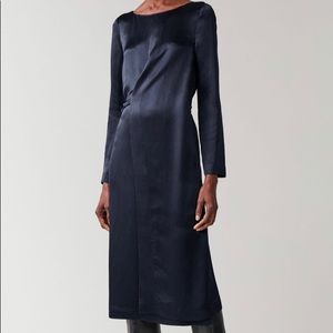 Elegant navy dress with long sleeves. Sleek and sophisticated design.