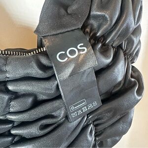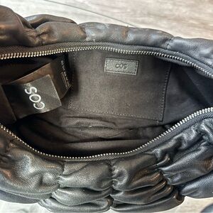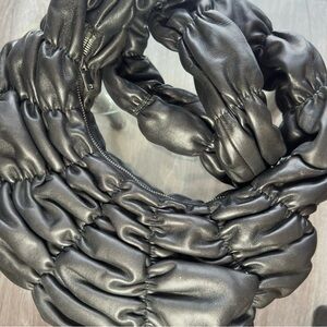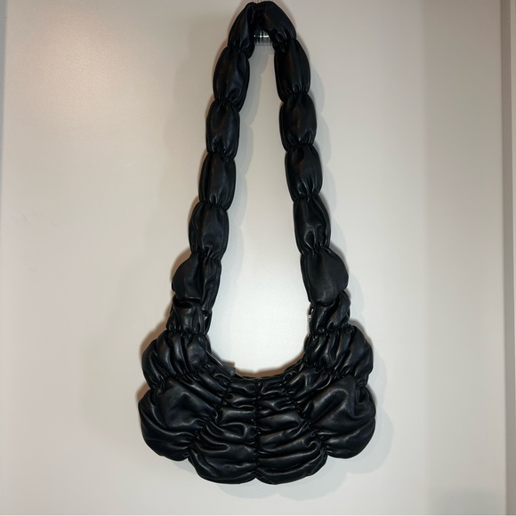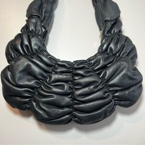 Sleek black shoulder bag with a gathered design. Perfect for modern elegance.