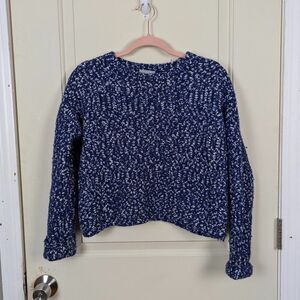 Cozy cropped sweater in navy and white speckled knit pattern, perfect for layering. Modern silhouette with ribbed texture throughout.